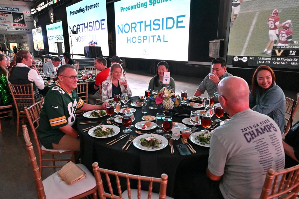 - 2025 Tailgate to Tackle Homelessness Benefit Gala – Sponsored by Northside Hospital, the annual Gala had been newly rebranded with a football theme and was hosted at Formetco in Duluth. Gala guests were greeted by volunteer cheerleaders with pom poms at the Rainbow Village tailgate tent before heading inside to a sports bar on steroids-like atmosphere. College football games were played live on big screens throughout the reception inside, while guests enjoyed cornhole, giant Jenga, and a mobile bar cart for sideline sips outside. Mascots Freddie Falcon and Lil’ Fred kept energy levels high, and renowned Emmy Award-winning sportscaster Ernie Johnson served as the emcee. Auctioneer Jordan Campbell led the auction and live appeal. Marking the most exciting auction moment, two bidders battled it out over a 10-day Expedition Cruise to the Galapagos Islands donated by National Geographic, with the final winning bid of $10,000. During the Mission Moment, each donor was given a light-up wand. At the end of the appeal, the overhead lights were lowered, and the wands were waved high to light up the room as a sign of brighter days ahead for Rainbow Village residents.