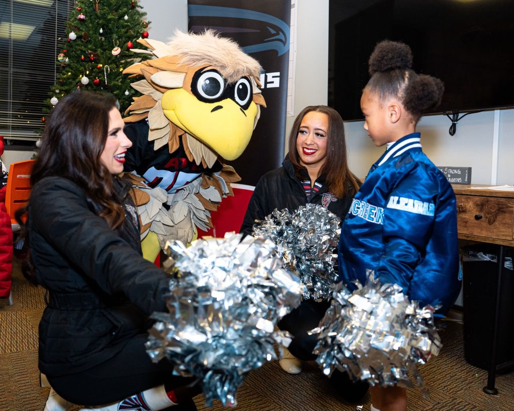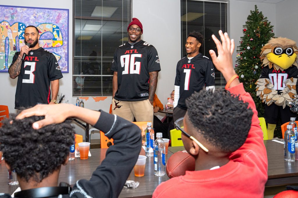 During the JB3 Single Mothers Initiative holiday visit to Rainbow Village, Bates recruited his fellow Falcons players, Wide Receiver Darnell Mooney, Defensive End Zach Harrison, and Safety Xavier Watts to join him. A genuine team effort, they also brought Falcons cheerleaders Bhelen T. and Kassidy O., a DJ, and even Freddie Falcon. During the event, they provided dinner, photo opportunities, Falcons swag for autographs, and family game night bags.